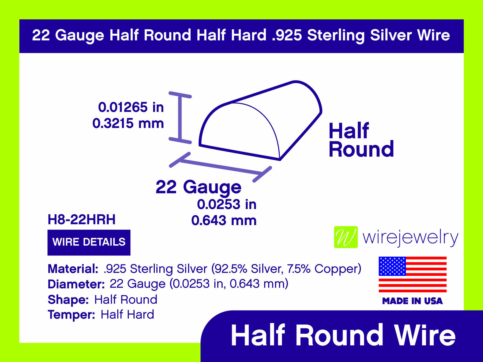 22 Gauge Half Round Half Hard .925 Sterling Silver Wire. Former product ID: H8-33.